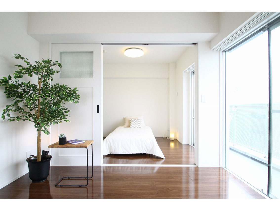 利便性のとても良い都会での暮らし。ただし、マンション自体はとても古く、2DK+3点ユニット(トイレ・バス・洗面一体)から1LDK+トイレ、洗面、浴室(UB)へと、間取り変更における配管計画が課題でした。洋室1部屋は2枚の扉を引き込むことでLDKと繋がったワンルームとして使うことも可能です。建具はチェッカーガラスの入ったものを用い、空間のアクセントになっています。